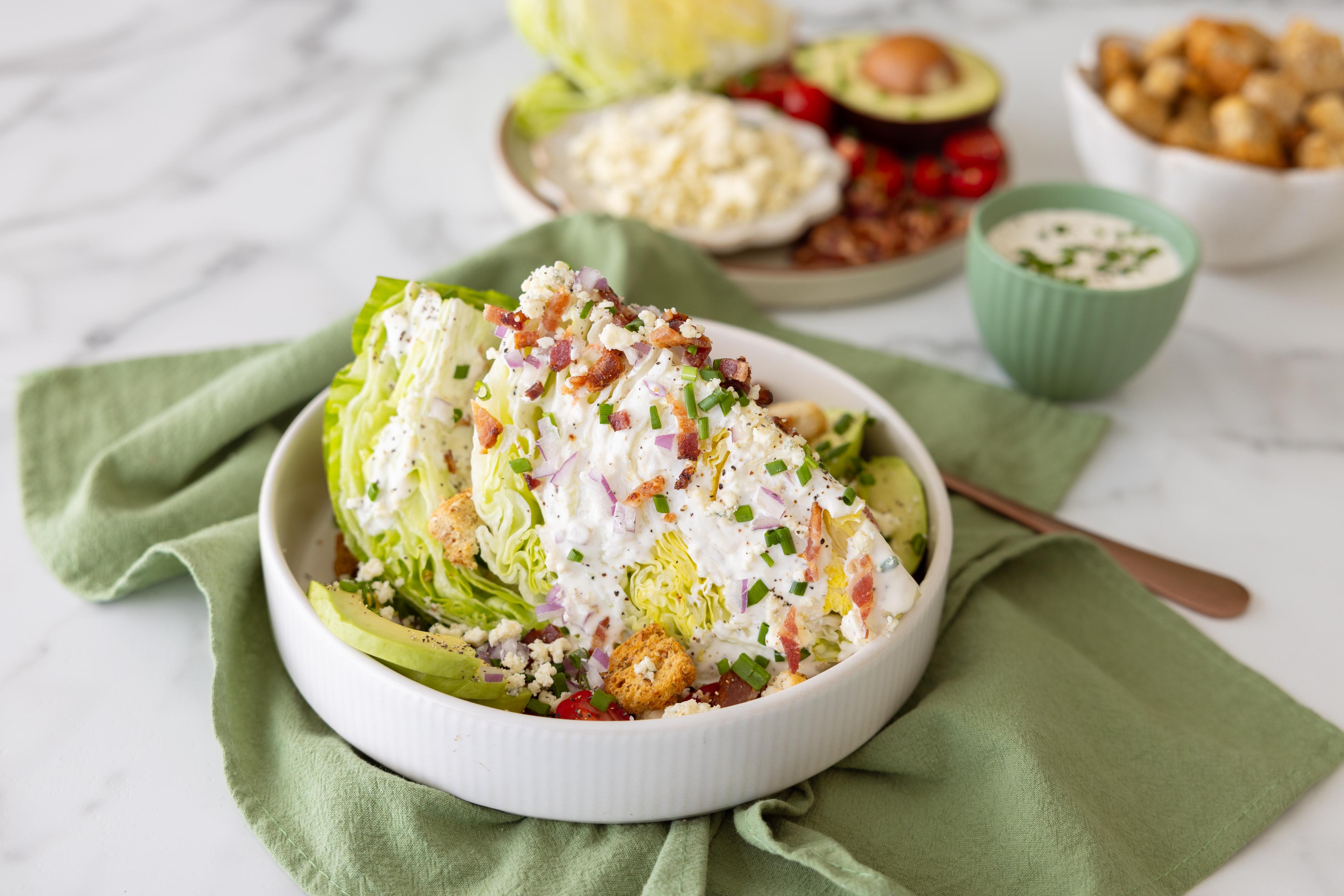 Wash iceberg lettuce before chopping into 4 even pieces, or divvy per diners’ requests. (Here’s why you should wash lettuce before cutting.) Divide sliced cherry tomatoes, avocado slices, cooked bacon crumbles, chives or onions and your favorite blue cheese dressing to create 4 salads. Place slices of avocado on the side for added color and taste. Halved hard-boiled eggs are a great addition, too.