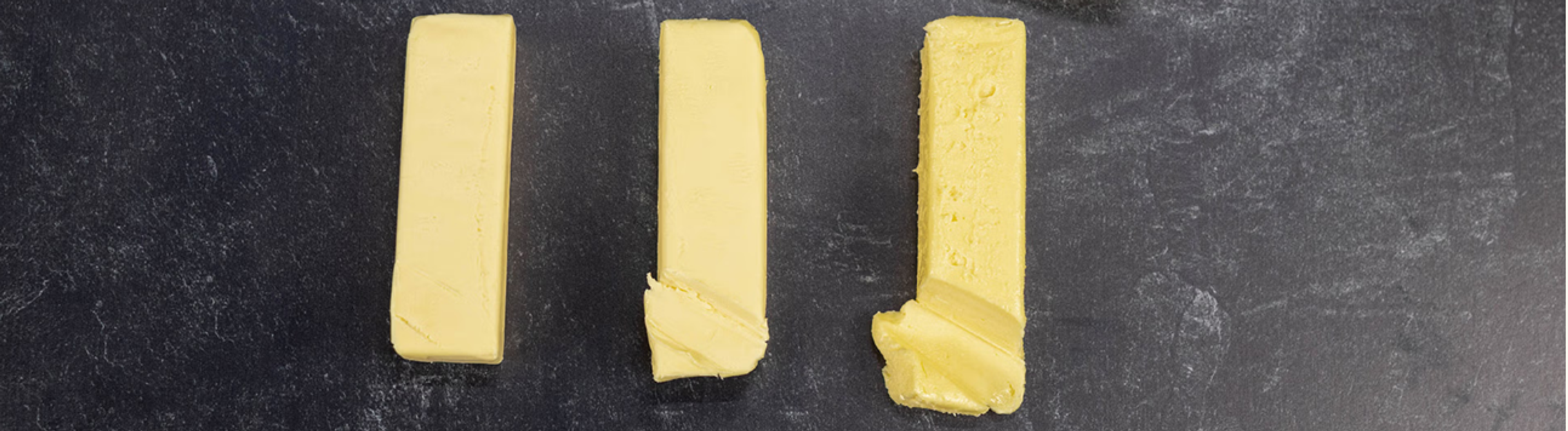 Left to right, chilled, softened and overly softened butter.