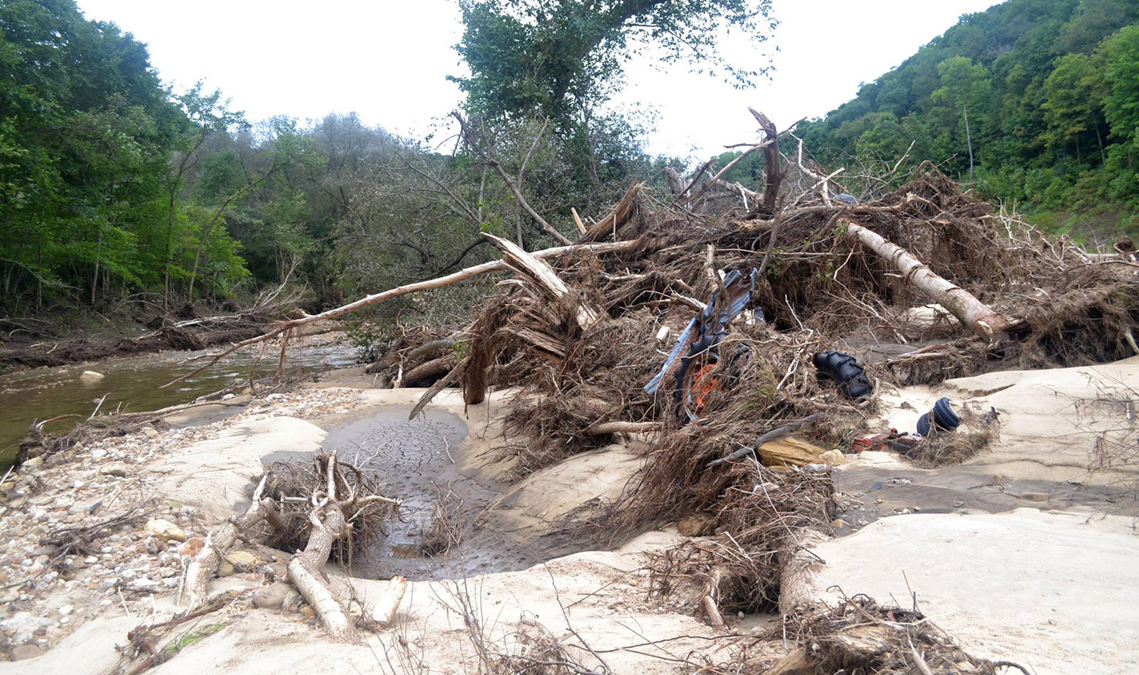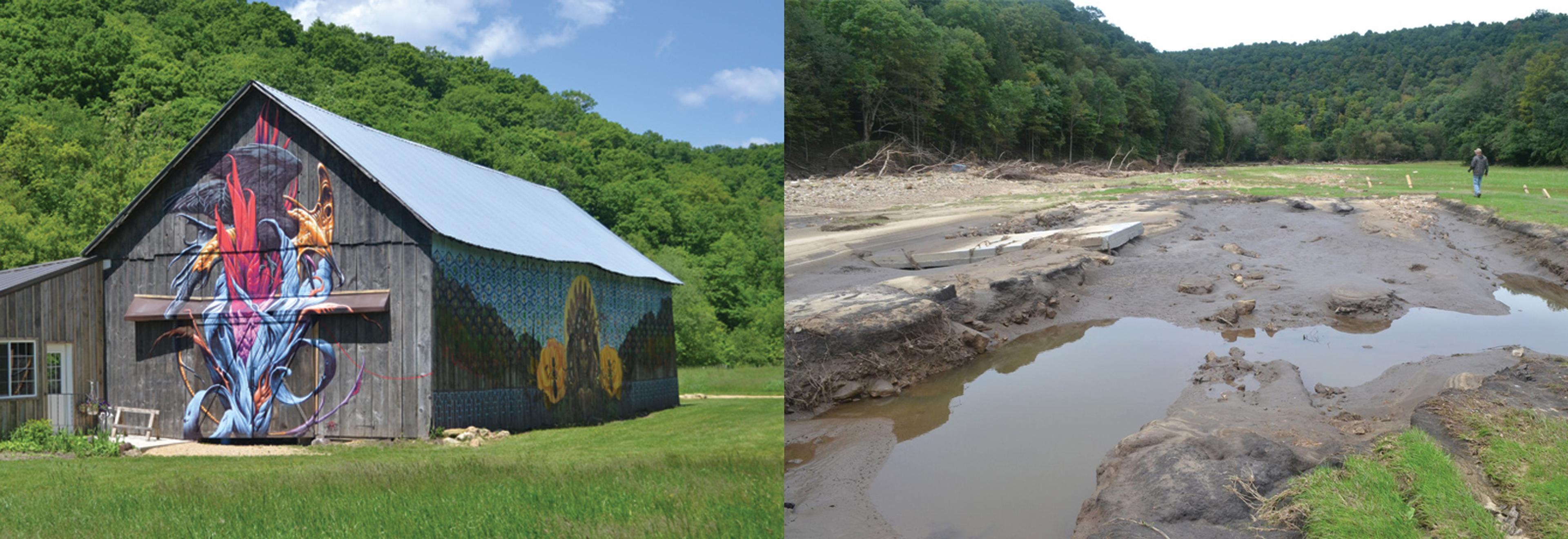 On the night of Aug. 27, 2018, Mother Nature dropped more than 14 inches of rain on this Wisconsin hill country just east of the Mississippi River. The deluge overwhelmed a 40-foot-deep, 20-acre erosion-control reservoir at the head of the painted barn’s valley. By 2:30 a.m. on the 28th, the dam burst and water screamed out with the force of a fire hose the size of ten subway trains. Amazingly, no one was seriously hurt, but scores of outbuildings, countless trees, tractors, vehicles, even much of a small town — all things in the path of this tsunami — were soaked or destroyed for many miles down the valley. Our Farm Art barn was the very first structure in the path of the massive wave.