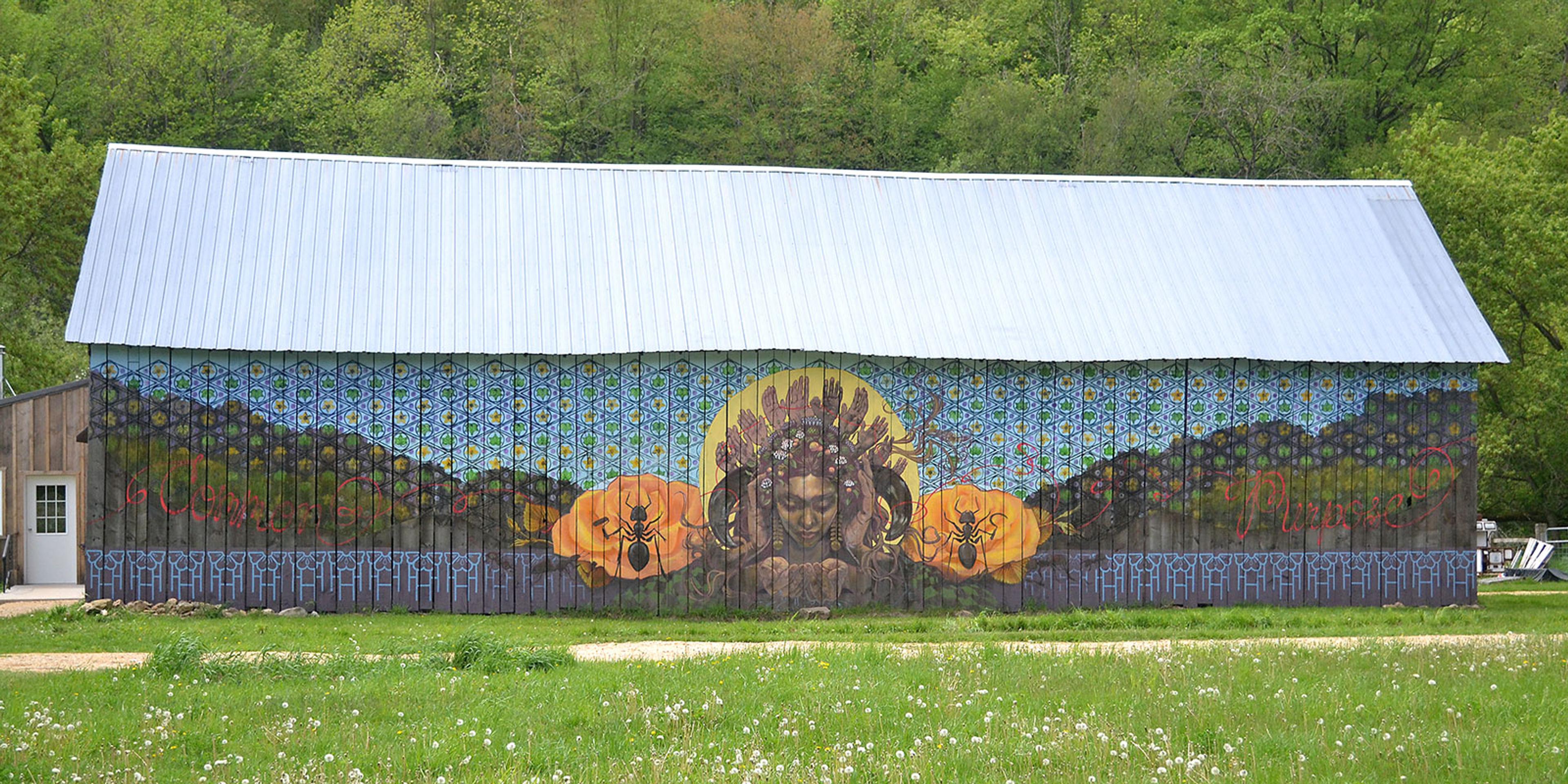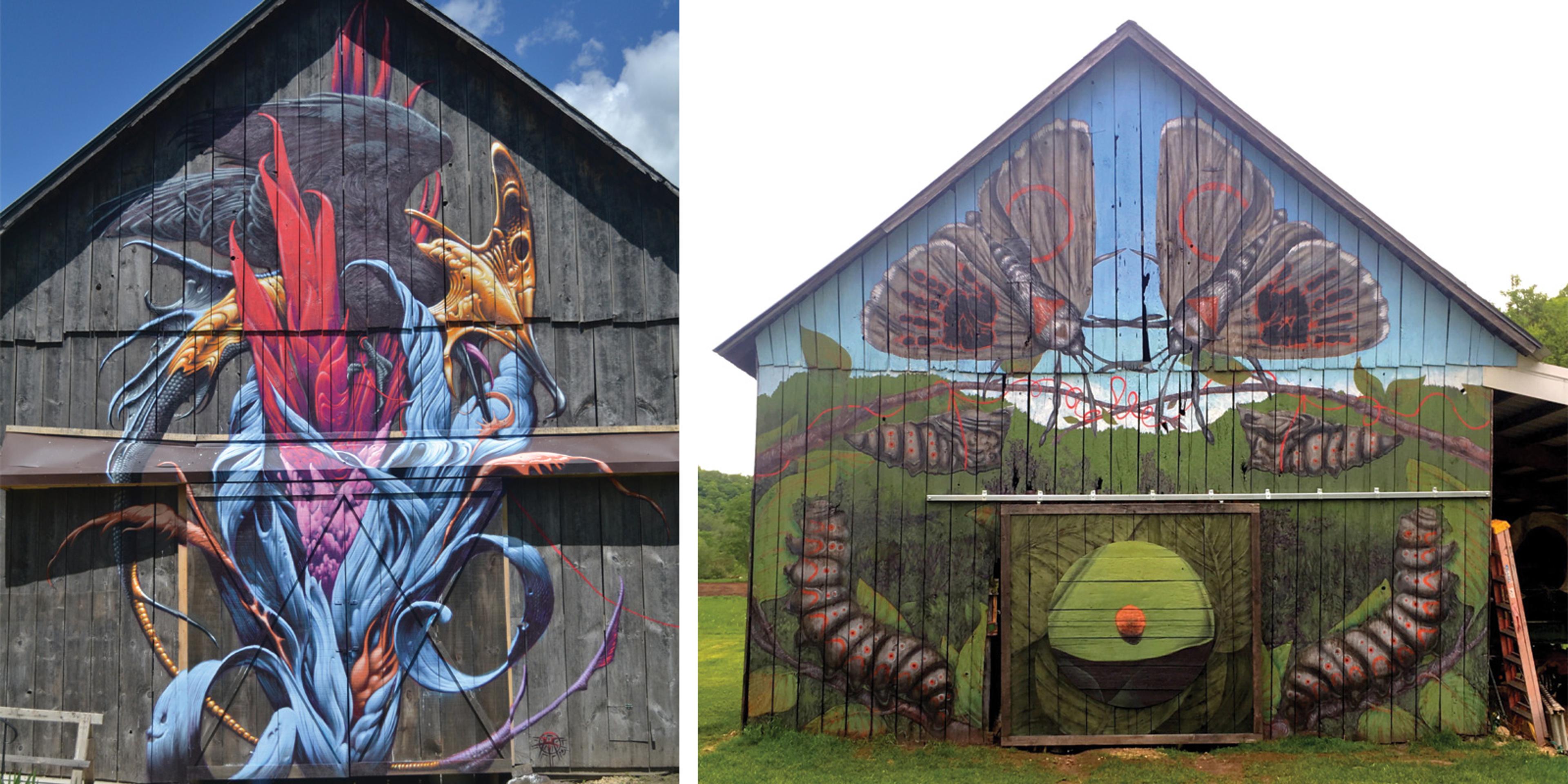 In the fall of 2017, these murals provided a lot of enjoyment to folks who visited the farm’s annual family fun days and pumpkin patch. Everyone loved to watch the artists at work, from Pete’s macro depiction of the circle of life (its main actors: tobacco worms painted larger-than-life on this retired tobacco barn), to Malena’s harmonies that sound when we work with nature instead of against it, to Aaron’s astonishingly frightful creatures that will thrive when we don’t. A swirling red thread of paint brought the three together in common purpose, to steward the gifts we share today into our families’ shared future.