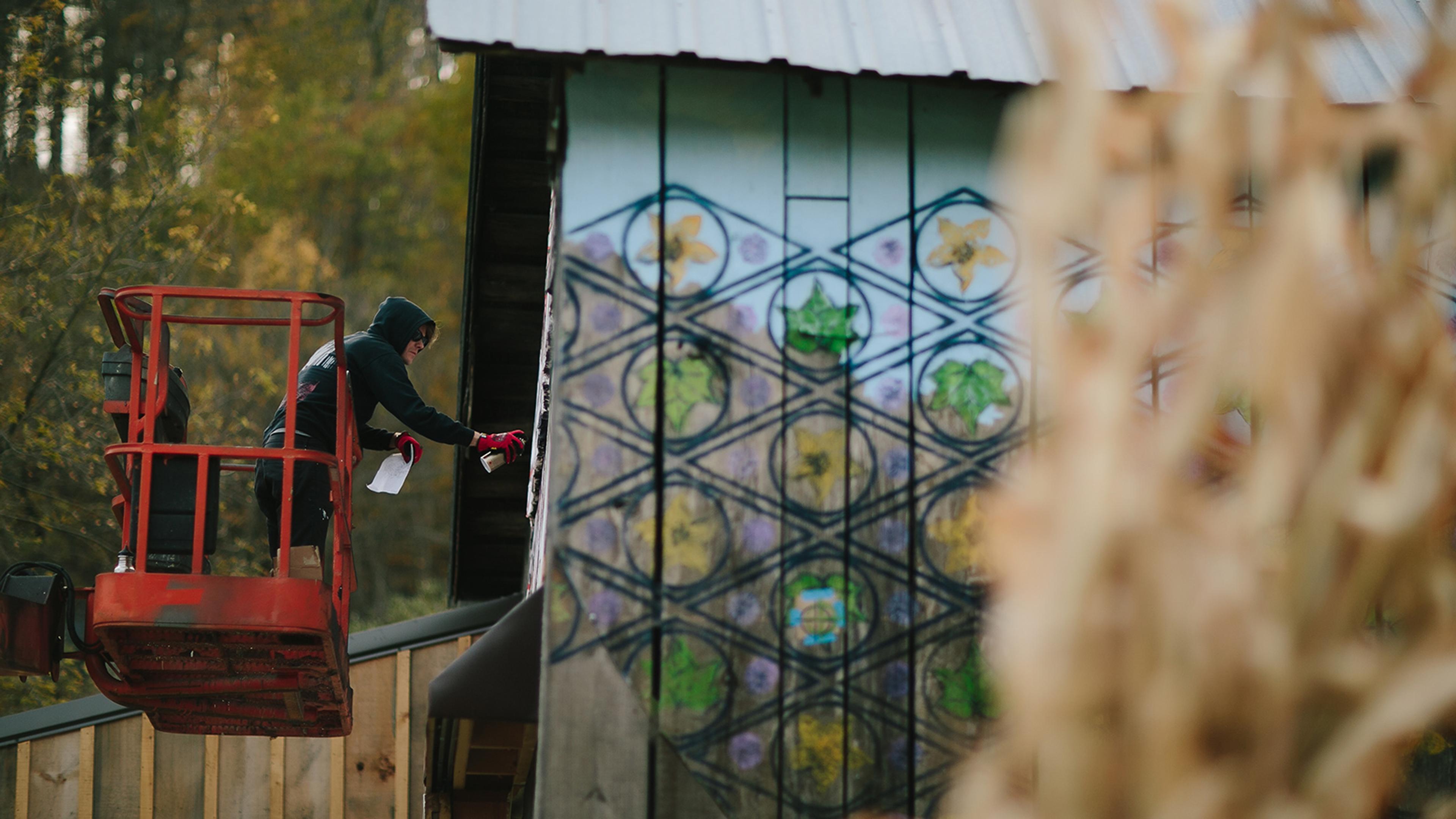That’s why we invited three hard-working artists to paint murals on an old barn deep in a gorgeous Wisconsin valley on an Organic Valley family farm. We figured it would be constructive juxtapositioning to bring a genre of art that’s blossoming in cities out to the farm — to remind ourselves that we’re all one big community on a little blue ball. We asked artists Malena Handeen, Aaron Horkey, and Pete Hodapp to create art about the cooperative spirit that thrives everywhere from Main Street to the amber waves. They were free to create from their heart on three barn-side canvasses. We’d film them making the art and post the video online, so people everywhere could see the color and connection created within this green valley.