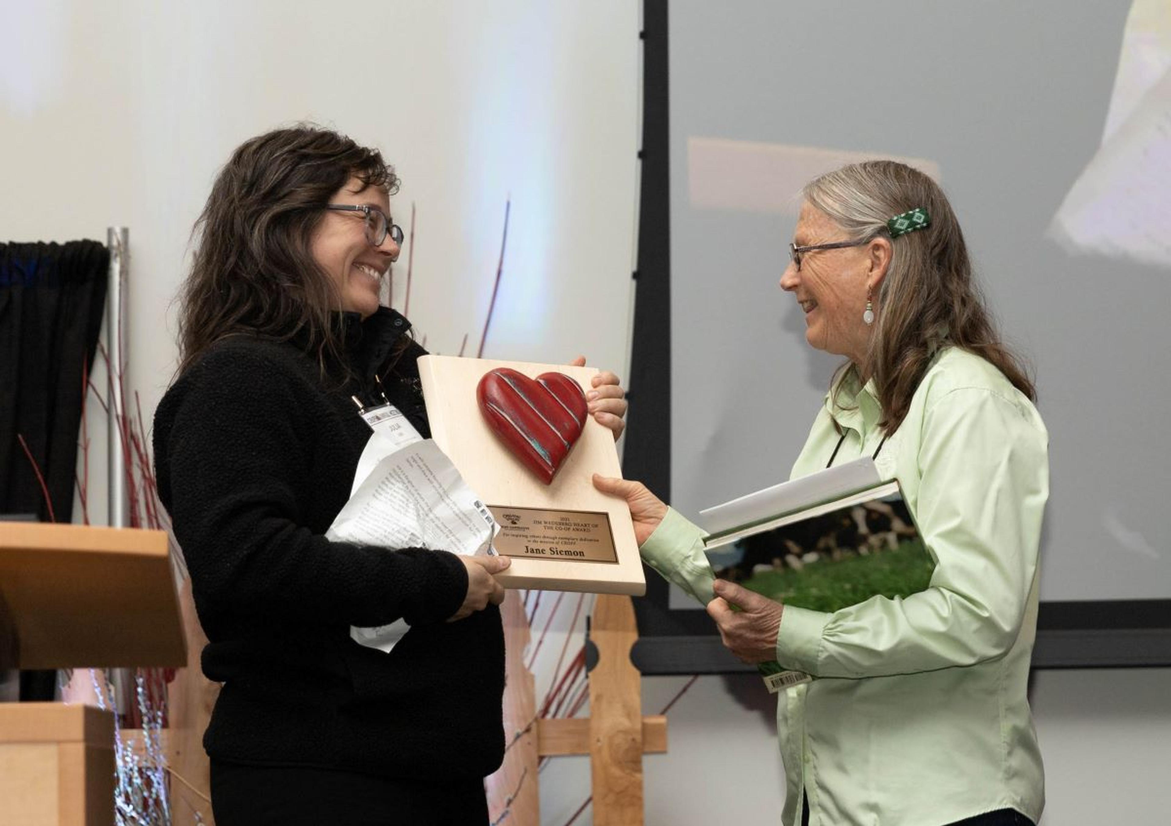 Organic Valley team member Julia Ugo, left, awards Jane Siemon.